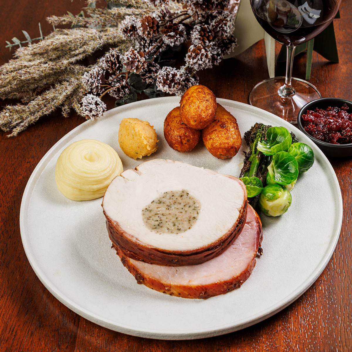 Individual sliced stuffed turkey & ham portions ready to heat & serve.